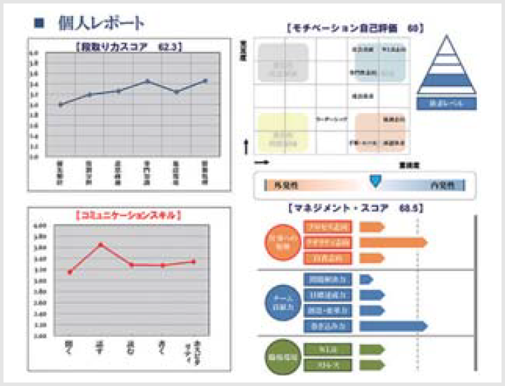 一人ひとりのモチベーションの要因を明らかにし、関連する理論で体系的に整理していますので、診断結果は実践的に活用できる内容となっています。 また、ワーク・ライフ・バランスに必要な組織の段取り力(優先順位、役割分担、専門知識など)を数値化することによって、仕事の生産性を向上させるべくスキル課題を抽出します。