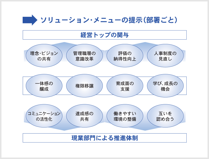 分析ロジックとして、モチベーション理論やタイムマネジメントの考え方を取り入れ、“離職”や“ぶら下がり”といった組織運営の問題を解決できるよう、具体的な施策を導き出すことで、マネジメント・サイクルの好循環につなげていきます。